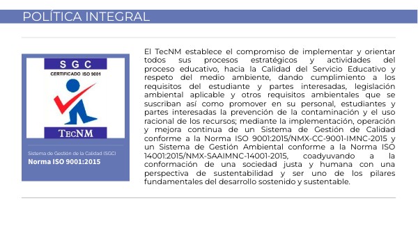 El TecNM establece el compromiso de implementar y orientar todos sus procesos estratégicos y actividades del proceso educativo, hacia la Calidad del Servicio Educativo y respeto del medio ambiente, dando cumplimiento a los requisitos del estudiante y partes interesadas, legislación ambiental aplicable y otros requisitos ambientales que se suscriban así como promover en su personal, estudiantes y partes interesadas la prevención de la contaminación y el uso racional de los recursos; mediante la implementación, operación y mejora continua de un Sistema de Gestión de Calidad conforme a la Norma ISO 9001:2015/NMX-CC-9001-IMNC-2015 y un Sistema de Gestión Ambiental conforme a la Norma ISO 14001:2015/NMX-SAAIMNC-14001-2015, coadyuvando a la conformación de una sociedad justa y humana con una perspectiva de sustentabilidad y ser uno de los pilares fundamentales del desarrollo sostenido y sustentable.