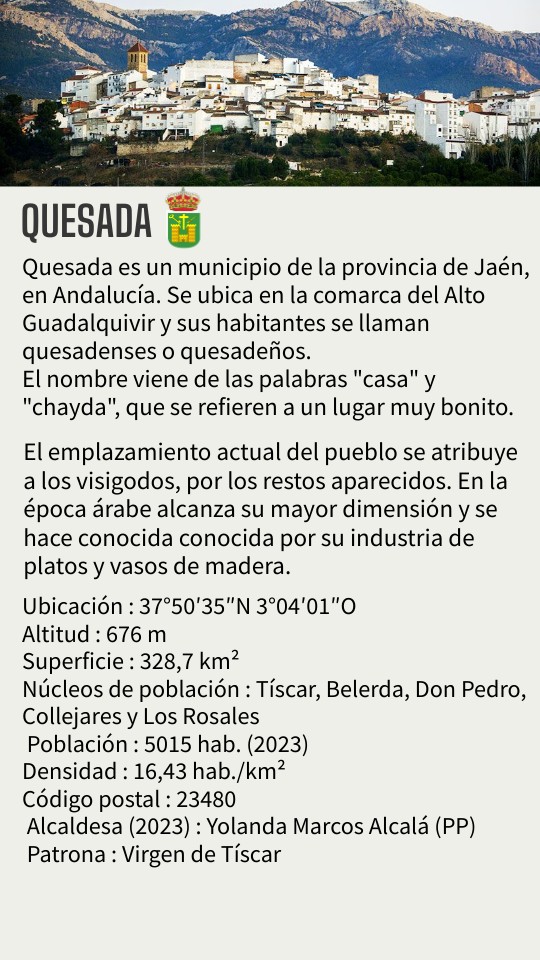 Quesada es un municipio de la provincia de Jaén, en Andalucía. Se ubica en la comarca del Alto Guadalquivir y sus habitantes se llaman quesadenses o quesadeños. El nombre viene de las palabras "casa" y "chayda", que se refieren a un lugar muy bonito.