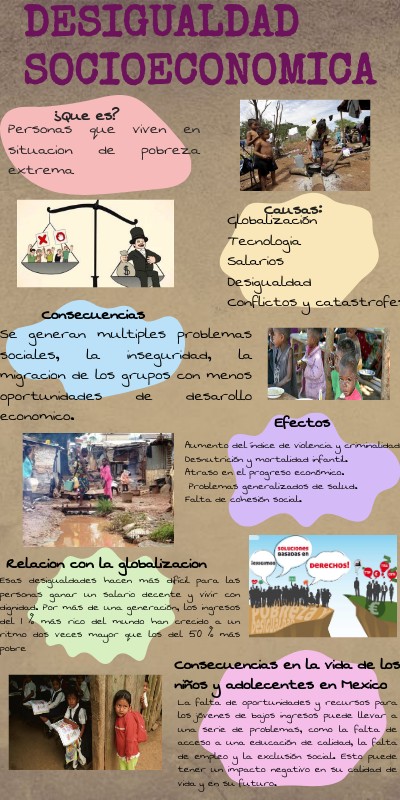 Globalización: La apertura de mercados y la competencia global han beneficiado más a algunas empresas y países que a otros. Tecnología: El avance tecnológico ha valorado más algunas habilidades que otras, lo que genera una brecha en los salarios y las oportunidades laborales. Salarios bajos y marcos laborales precarios: Un sector de la población recibe ingresos muy bajos y tiene poca protección social y laboral. Desigualdad de género: Las mujeres sufren una brecha salarial y tienen menos acceso a la formación y a los espacios de toma de decisiones. Conflictos y catástrofes: Las guerras y los desastres naturales afectan más a las poblaciones más vulnerables y empobrecidas. Más información: