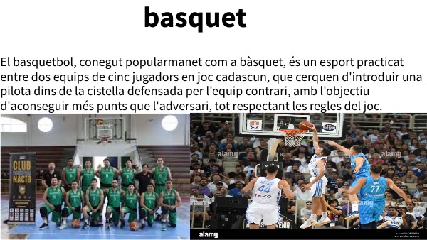 El basquetbol, conegut popularmanet com a bàsquet, és un esport practicat entre dos equips de cinc jugadors en joc cadascun, que cerquen d'introduir una pilota dins de la cistella defensada per l'equip contrari, amb l'objectiu d'aconseguir més punts que l'adversari, tot respectant les regles del joc.