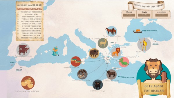Πάνω στον χάρτη βλέπεις αριθμούς και εικονίδια που δείχνουν τα μέρη που χρειάστηκε να πάει ο Ηρακλής, για να πραγματοποιήσει τους Άθλους του. Οι Άθλοι είναι τοποθετημένοι στον χάρτη με χρονική σειρά και αριθμημένοι. Κάνε κλικ πάνω στο εικονίδιο που οδηγεί κάθε αριθμός, για να δεις περισσότερες λεπτομέρειες για τον συγκεκριμένο Άθλο που σε ενδιαφέρει.