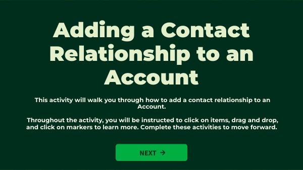 This activity will walk you through how to add a contact relationship to an Account. Throughout the activity, you will be instructed to click on items, drag and drop, and click on markers to learn more. Complete these activities to move forward.