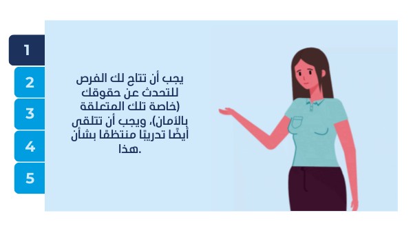 يجب أن تتاح لك الفرص للتحدث عن حقوقك (خاصة تلك المتعلقة بالأمان)، ويجب أن تتلقى أيضًا تدريبًا منتظمًا بشأن هذا.