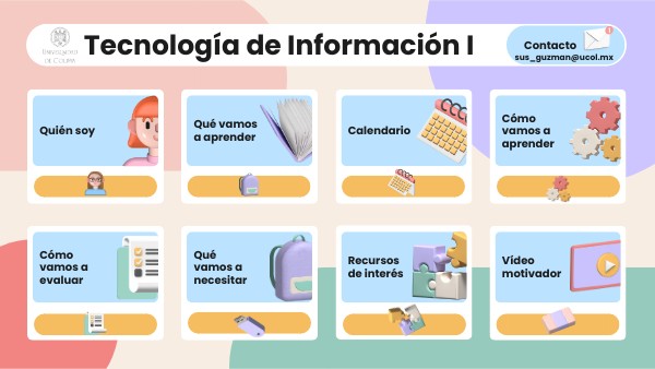 Bienvenida, Bienvenido a este curso de Tecnología En esta clase TU eres la persona mas importante, ya que las actividades que aquí se presentan, están diseñadas para que de manera individual o bajo conducción de tu docente, logres nuevos y divertidos aprendizajes que sumarán a tu preparación académica logrando facilmente tus objetivos profesionales. Esta etapa, es una etapa para crecer, lograr amigos, decubrir y construir nuevos retos. Te deseo mucho éxito.