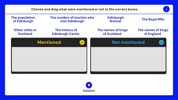 The population of Edinburgh; The Royal Mile The names of kings of Scotland; The number of tourists who visit Edinburgh; Edinburgh festival; The history of Edinburgh Castle