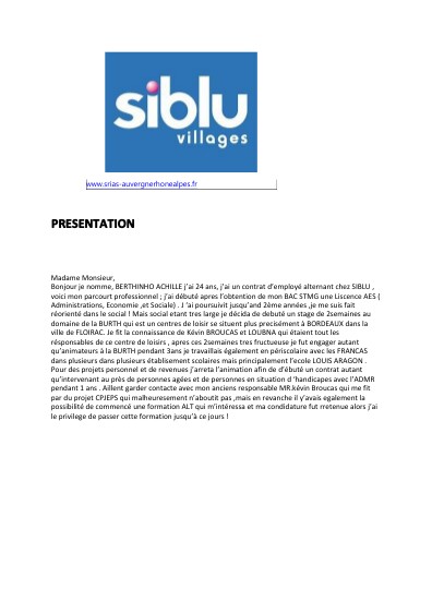 Madame Monsieur,Bonjour je nomme, BERTHINHO ACHILLE j’ai 24 ans, j’ai un contrat d’employé alternant chez SIBLU , voici mon parcourt professionnel ; j’ai débuté apres l’obtention de mon BAC STMG une Liscence AES (Administrations, Economie ,et Sociale) . J ‘ai poursuivit jusqu’and 2ème années ,je me suis fait réorienté dans le social ! Mais social etant tres large je décida de debuté un stage de 2semaines au domaine de la BURTH qui est un centres de loisir se situent plus precisément à BORDEAUX dans la ville de FLOIRAC. Je fit la connaissance de Kévin BROUCAS et LOUBNA qui étaient tout les résponsables de ce centre de loisirs , apres ces 2semaines tres fructueuse je fut engager autant qu’animateurs à la BURTH pendant 3ans je travaillais également en périscolaire avec les FRANCAS dans plusieurs dans plusieurs établisement scolaires mais principalement l’ecole LOUIS ARAGON . Pour des projets personnel et de revenues j’arreta l’animation afin de d’ébuté un contrat autant qu’intervenant au près de personnes agées et de personnes en situation d ‘handicapes avec l’ADMR pendant 1 ans . Aillent garder contacte avec mon anciens responsable MR.kévin Broucas qui me fit par du projet CPJEPS qui malheuresement n’aboutit pas ,mais en revanche il y’avais egalement la possibilité de commencé une formation ALT qui m’intéressa et ma condidature fut rretenue alors j’ai le privilege de passer cette formation jusqu’à ce jours !