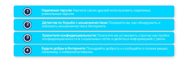 Надежные пароли: Научите своих друзей использовать надежные, уникальные пароли.