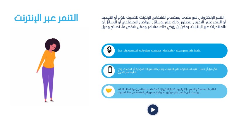 اطلب المساعدة والدعم - إذا واجهت تنمرًا إلكترونيًا، فلا تستجب للمتنمرين، واحتفظ بالأدلة، وتحدث إلى شخص بالغ موثوق به أو أبلغ مسؤولي المنصة عن هذا السلوك.