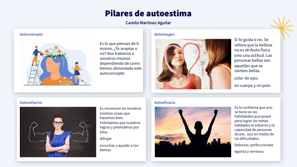 Es la confianza que uno se tiene en las habilidades que posee para lograr las metas. Validades el esfuerzo y la capacidad de personas de pie, aun en medio de las dificultades Defectos: perfeccionista egoista y nerviosa