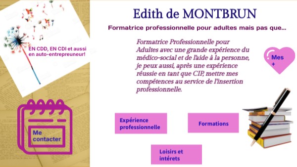 Formatrice Professionnelle pour Adultes avec une grande expérience du médico-social et de l'aide à la personne, je peux aussi, après une expérience réussie en tant que CIP, mettre mes compétences au service de l'insertion professionnelle.