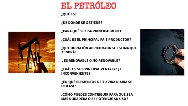 ¿QUÉ ES? ¿DE DÓNDE SE OBTIENE? ¿PARA QUÉ SE USA PRINCIPALMENTE ¿CUÁL ES EL PRINCIPAL PAÍS PRODUCTOR? ¿QUÉ DURACIÓN APROXIMADA SE ESTIMA QUE TENDRÁ? ¿ES RENOVABLE O NO RENOVABLE? ¿CUÁL ES SU PRINCIPAL VENTAJA? ¿E INCONVENIENTE? ¿EN QUÉ ELEMENTOS DE TU VIDA DIARIA SE UTILIZA? ¿CÓMO PUEDES CONTRIBUIR PARA QUE SEA MÁS DURADERA O SE POTENCIE SU USO?