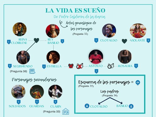 Protagonista de la obra. Fue encerrado por su padre desde su nacimiento debido a una profecía que predijo que sería un gobernante cruel y tirano. - Aunque después es devuelto a la corte de Polonia, este actúa con brutalidad y arrogancia, cumpliendo aparentemente la profecía, por lo que vulve a ser encerrado. Más tarde, Segismundo es liberado de nuevo, esta vez actuando con sabiduría y justicia, demostrando que ha aprendido de su experiencia. Segismundo es un personaje complejo y profundo cuyo viaje desde la opresión hasta la iluminación personal y la justicia es el corazón de "La vida es sueño".