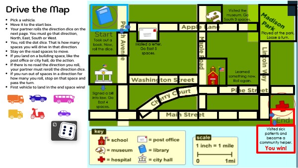- You, roll the dot dice. That is how many spaces you will drive in that direction.