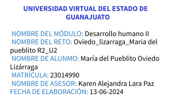 UNIVERSIDAD VIRTUAL DEL ESTADO DE GUANAJUATO NOMBRE DEL MÓDULO: Desarrollo humano II NOMBRE DEL RETO: Oviedo_lizarraga_Maria del pueblito R2_U2 NOMBRE DE ALUNMO: María del Pueblito Oviedo Lizárraga MATRÍCULA: 23014990 NOMBRE DE ASESOR: Karen Alejandra Lara Paz FECHA DE ELABORACIÓN: 13-06-2024