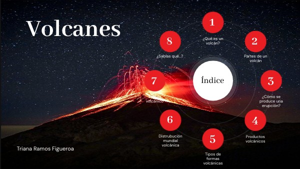 1. ¿Qué es un volcán? 2. Partes de un volcán 3. ¿Cómo se produce una erupción? 4. Productos volcánicos 5. Tipos de formas volcánicas 6. Distribución mundial volcánica 7. Riesgo volcánico 8. ¿Sabías qué...?