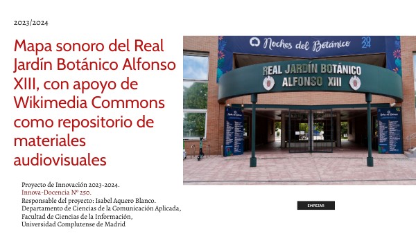 Título del proyecto: Mapa sonoro del Real Jardín Botánico Alfonso XIII con apoyo de Wikimedia Commons como repositorio de materiales audiovisuales. Este trabajo presenta un mapa con acceso sonoro y visual a las diferentes áreas de Real Jardín Botánico, ubicado en la Ciudad universitaria de Madrid. Navega por las páginas y haz click en los elementos interactivos rojos para poder escuchar y ver los materiales trabajados por el alumnado.