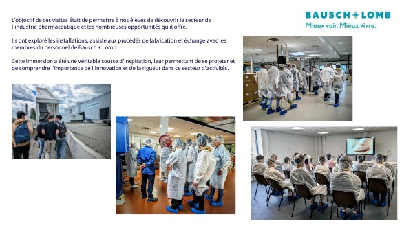 L’objectif de ces visites était de permettre à nos élèves de découvrir le secteur de l'industrie pharmaceutique et les nombreuses opportunités qu’il offre. Ils ont exploré les installations, assisté aux procédés de fabrication et échangé avec les membres du personnel de Bausch + Lomb. Cette immersion a été une véritable source d’inspiration, leur permettant de se projeter et de comprendre l’importance de l’innovation et de la rigueur dans ce secteur d'activités.
