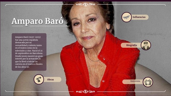 Amparo Baró (1937-2015) fue una actriz española destacada por su versatilidad y talento tanto en el teatro como en la televisión y cine. Nació el 21 de septiembre en Barcelona. Desde joven mostró un gran interés por la actuación,lo que la llevó a iniciar su carrera en el teatro a finales de los años 50.