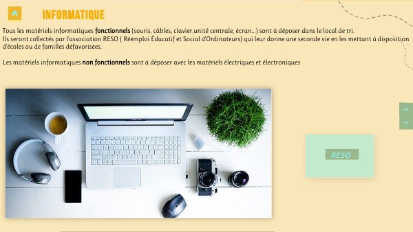 Tous les matériels informatiques fonctionnels (souris, câbles, clavier,unité centrale, écran...) sont à déposer dans le local de tri.Ils seront collectés par l'association RESO ( Réemploi Éducatif et Social d'Ordinateurs) qui leur donne une seconde vie en les mettant à disposition d'écoles ou de familles défavorisées.Les matériels informatiques non fonctionnels sont à déposer avec les matériels électriques et électroniques