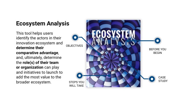 This tool helps users identify the actors in their innovation ecosystem and determine their comparative advantage, and, ultimately, determine the role(s) of their team or organization can play and initiatives to launch to add the most value to the broader ecosystem.