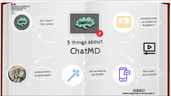 ChatMD est une application crée par Cedric Eysette de la DRANE de Lyon. Le principe : créer un document en Markdown et personnaliser votre Chatbot. en ajoutant image, lien, réponses rapides, avatar, ... en respectant la syntaxe de ChatMD. Particularités : - ce chatbot est Opensource disponible sur la Forge des Communs Numériques - il est alimenté en Markdown Plus values pour l'enseignement : - contrôle des données et gratuité - diffusion de l'agent conversationnel par lien et donc par qr-code et intégration sous forme de bulles - pas de nécessité de compte - chatbot evolutif avec possibilité d'inclure LLM et RAG
