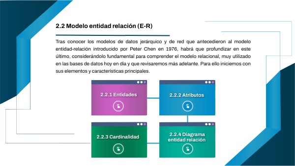 Tras conocer los modelos de datos jerárquico y de red que antecedieron al modelo entidad-relación introducido por Peter Chen en 1976, habrá que profundizar en este último, considerándolo fundamental para comprender el modelo relacional, muy utilizado en las bases de datos hoy en día y que revisaremos más adelante. Para ello iniciemos con sus elementos y características principales.