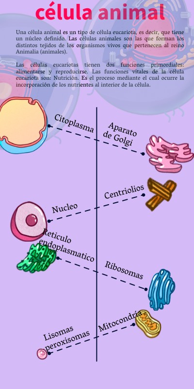 Una célula animal es un tipo de célula eucariota, es decir, que tiene un núcleo definido. Las células animales son las que forman los distintos tejidos de los organismos vivos que pertenecen al reino Animalia (animales). Las células eucariotas tienen dos funciones primordiales: alimentarse y reproducirse. Las funciones vitales de la célula eucariota son: Nutrición. Es el proceso mediante el cual ocurre la incorporación de los nutrientes al interior de la célula.