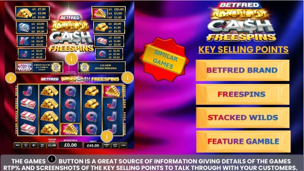 THE GAMES BUTTON IS A GREAT SOURCE OF INFORMATION GIVING DETAILS OF THE GAMES RTP% AND SCREENSHOTS OF THE KEY SELLING POINTS TO TALK THROUGH WITH YOUR CUSTOMERS.