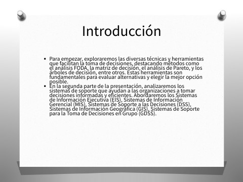 - En conclusión, el uso de diversas técnicas y herramientas para la toma de decisiones, junto con la implementación de sistemas de soporte específicos, es fundamental para mejorar la eficiencia y efectividad en la gestión organizacional. Estas metodologías y tecnologías permiten evaluar alternativas, analizar datos complejos y tomar decisiones informadas, contribuyendo al éxito y sostenibilidad de las organizaciones en un entorno empresarial competitivo.