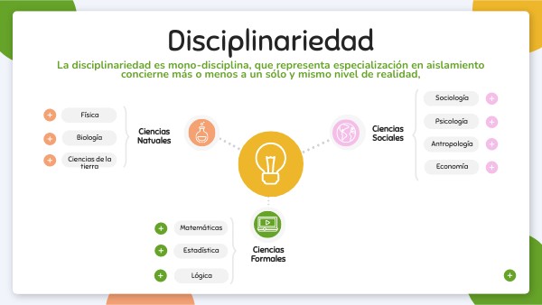 La disciplinariedad es mono-disciplina, que representa especialización en aislamiento concierne más o menos a un sólo y mismo nivel de realidad,