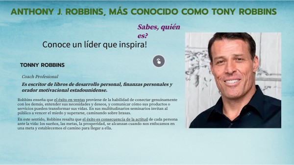 ¿Quién fue mentor de Tony Robbins? Jim Rohn Nacionalidad Estadounidense Información profesional Ocupación Orador motivacional, emprendedor y escritor Área Desarrollo personal. ¿Cómo se llama la empresa de Tony Robbins? Tony Robbins Área Programación neurolingüística, desde 1978.