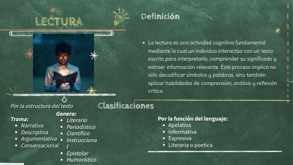- La lectura es una actividad cognitiva fundamental mediante la cual un individuo interactúa con un texto escrito para interpretarlo, comprender su significado y extraer información relevante. Este proceso implica no sólo decodificar símbolos y palabras, sino también aplicar habilidades de comprensión, análisis y reflexión crítica