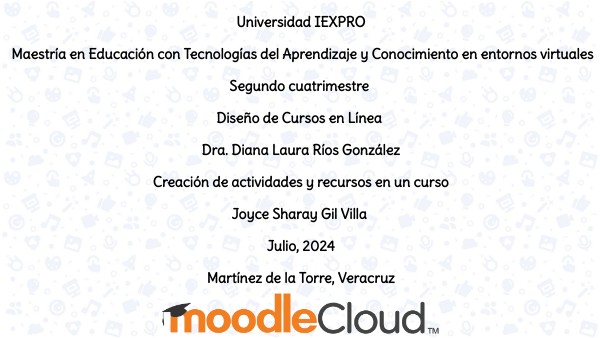 Universidad IEXPRO Maestría en Educación con Tecnologías del Aprendizaje y Conocimiento en entornos virtuales Segundo cuatrimestre Diseño de Cursos en Línea Dra. Diana Laura Ríos González Creación de actividades y recursos en un curso Joyce Sharay Gil Villa Julio, 2024 Martínez de la Torre, Veracruz