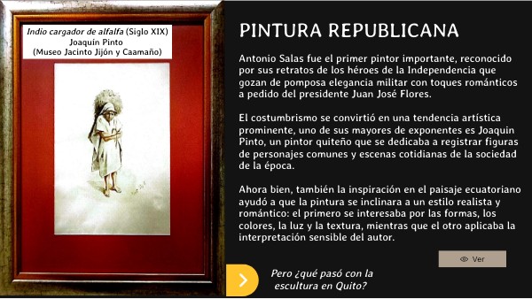 Sin embargo, la escultura no tuvo un desarrollo igual de relevante que la pintura, pues en Quito su práctica había disminuido y muchos de los monumentos de conmemoración fueron importados.