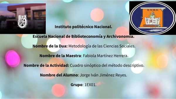 Instituto politécnico Nacional. Escuela Nacional de Biblioteconomía y Archivonomia. Nombre de la Dua: Metodología de las Ciencias Sociales. Nombre de la Maestra: Fabiola Martínez Herrera. Nombre de la Actividad: Cuadro sinóptico del método descriptivo. Nombre del Alumno: Jorge Iván Jiménez Reyes. Grupo: 1EX01.
