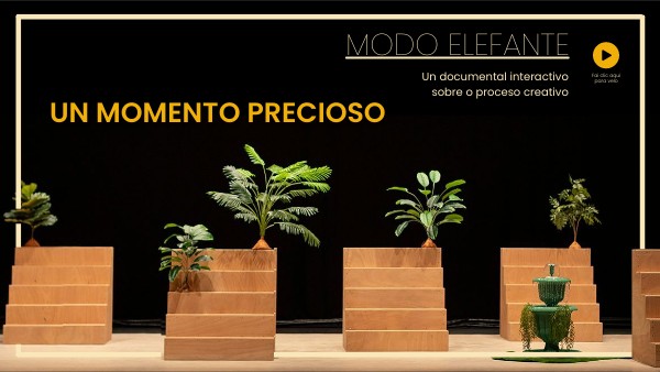 MODO ELEFANTE, é unha fiestra pola cal observar de preto o desenvolvemento dos procesos creativos do Elefante Elegante a través dun documental interactivo -webdoc-. PRODUCIÓN, GRABACIÓN e REALIZACIÓN Laura Duarte SOPORTE DIXITAL Laura Duarte COORDINACIÓN e DIRECIÓN ARTÍSTICA María Torres y Gonçalo Guerreiro DESEÑO GRÁFICO Carolina Díguele FOTOGRAFÍAS VANE RÁBADE ADMINISTRACIÓN e DISTRIBUCIÓN Xurxo Prieto MODO ELEFANTE é un proxecto de ELEFANTE ELEGANTE Subvencionado polo MINISTERIO DE CULTURA Y DEPORTE UN MOMENTO PRECIOSO é un espectáculo de ELEFANTE ELEGANTE Subvencionado por AGADIC Coproducido polo CONCELLO DE CULLEREDO Colabora CULTURA FERROL