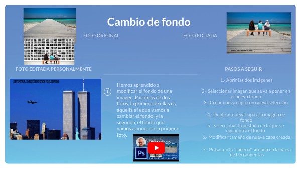 Hemos aprendido a modificar el fondo de una imagen. Partimos de dos fotos, la primera de ellas es aquella a la que vamos a cambiar el fondo, y la segunda, el fondo que vamos a poner en la primera foto.