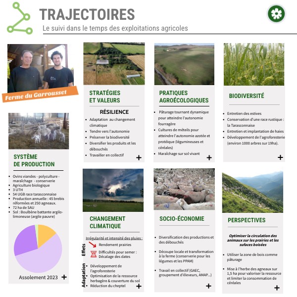 Par la mise en place de pratiques agroécologiques, la Ferme du Garrousset cherche à améliorer la résilience et l'autonomie de leur système. Cela passe à la fois par l'optimisation des synergies sol-troupeau et par des actions d'adaptation au changement climatique.
