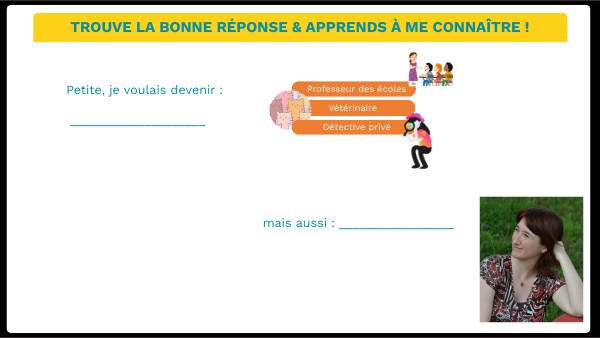 Au collège, il fallait rédiger un dossier sur un métier, je ne savais pas trop quoi prendre, alors j'ai opté pour professeur des écoles. Avec le recul, je sais que j'aime enseigner et transmettre. Un jour sûrement, je ferai des conférences !