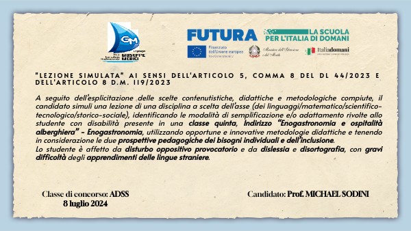 A seguito dell’esplicitazione delle scelte contenutistiche, didattiche e metodologiche compiute, il candidato simuli una lezione di una disciplina a scelta dell’asse (dei linguaggi/matematico/scientifico-tecnologico/storico-sociale), identificando le modalità di semplificazione e/o adattamento rivolte allo studente con disabilità presente in una classe quinta, Indirizzo “Enogastronomia e ospitalità alberghiera” - Enogastronomia, utilizzando opportune e innovative metodologie didattiche e tenendo in considerazione le due prospettive pedagogiche dei bisogni individuali e dell’inclusione.Lo studente è affetto da disturbo oppositivo provocatorio e da dislessia e disortografia, con gravi difficoltà degli apprendimenti delle lingue straniere.