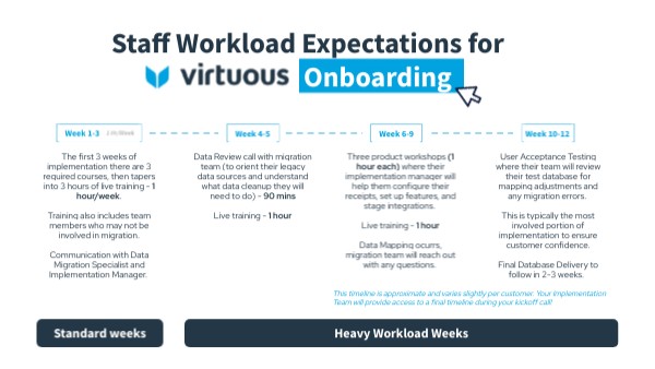 The first 3 weeks of implementation there are 3 required courses, then tapers into 3 hours of live training - 1 hour/week. Training also includes team members who may not be involved in migration. Communication with Data Migration Specialist and Implementation Manager.
