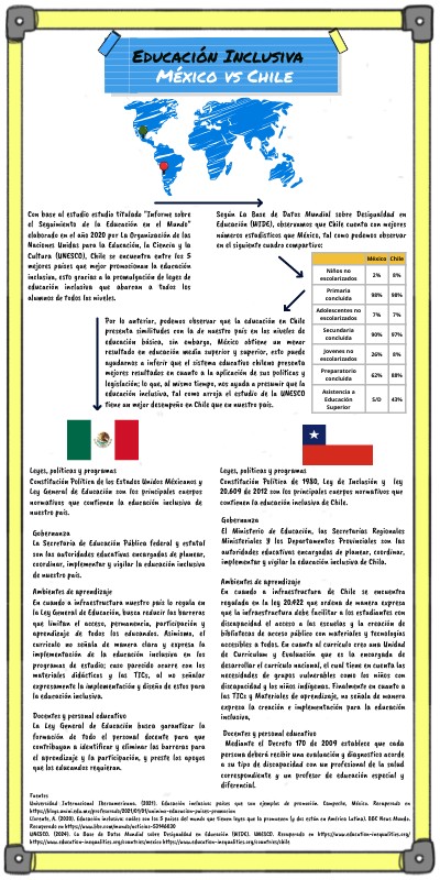 FuentesUniversidad Internacional Iberoamericana. (2021). Educación inclusiva: países que son ejemplos de promoción. Campeche, México. Recuperado en https://blogs.unini.edu.mx/profesorado/2021/01/01/uninimx-educacion-paises-promocion Llorente, A. (2020). Educación inclusiva: cuáles son los 5 países del mundo que tienen leyes que la promueven (y dos están en América Latina). BBC News Mundo. Recuperado en https://www.bbc.com/mundo/noticias-53146030 UNESCO. (2024). La Base de Datos Mundial sobre Desigualdad en Educación (WIDE). UNESCO. Recuperado en https://www.education-inequalities.org/ https://www.education-inequalities.org/countries/mexico https://www.education-inequalities.org/countries/chile