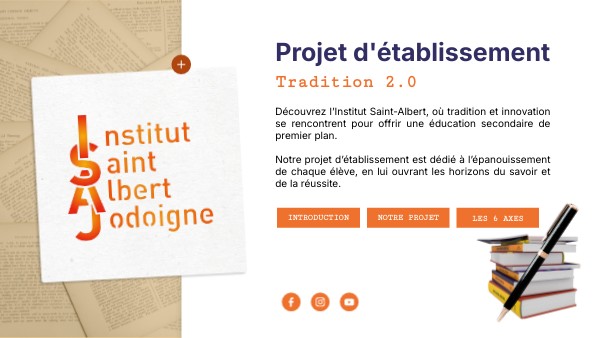 Découvrez l’Institut Saint-Albert, où tradition et innovation se rencontrent pour offrir une éducation secondaire de premier plan. Notre projet d’établissement est dédié à l’épanouissement de chaque élève, en lui ouvrant les horizons du savoir et de la réussite.