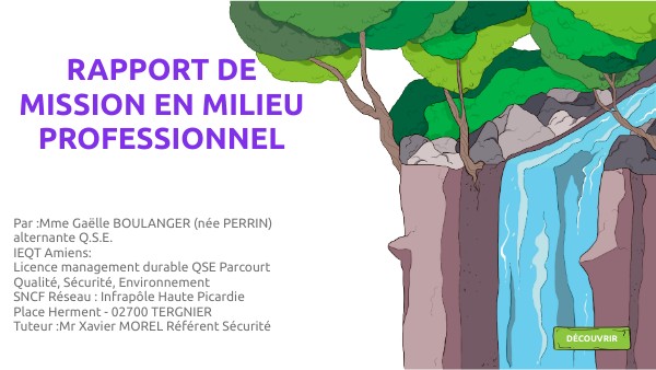 Par :Mme Gaëlle BOULANGER (née PERRIN) alternante Q.S.E. IEQT Amiens: Licence management durable QSE Parcourt Qualité, Sécurité, Environnement SNCF Réseau : Infrapôle Haute Picardie Place Herment - 02700 TERGNIER Tuteur :Mr Xavier MOREL Référent Sécurité