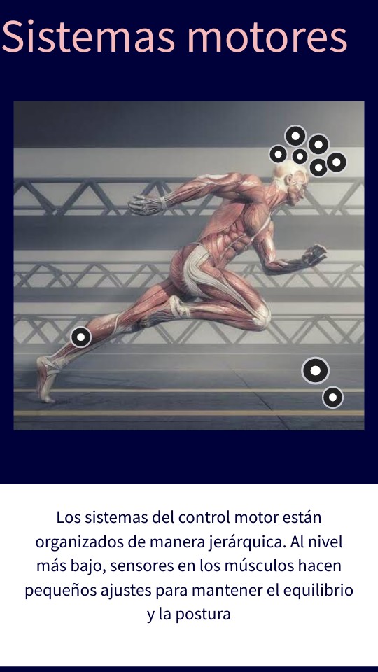 Los sistemas del control motor están organizados de manera jerárquica. Al nivel más bajo, sensores en los músculos hacen pequeños ajustes para mantener el equilibrio y la postura