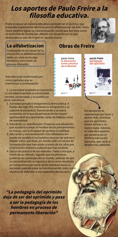 Freire propuso un sistema educativo centrado en el alumno, que pretendía implementar técnicas para la alfabetización de éste. Tenía como objetivo lograr su concientización, hecho que fue visto como un sinónimo de revolución, debido a la situación por la que atravesaba su país de origen en aquella época.