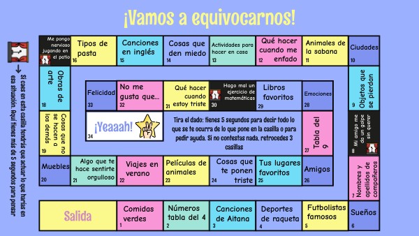 Tira el dado: tienes 5 segundos para decir todo lo que se te ocurra relacionado con lo que pone en la casilla o para pedir ayuda. Si no contestas nada, retrocedes 3 casillas