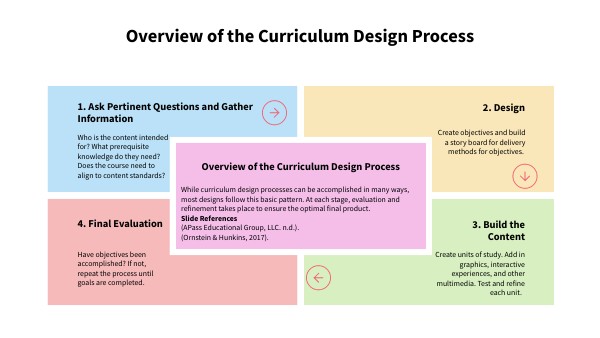 While curriculum design processes can be accomplished in many ways, most designs follow this basic pattern. At each stage, evaluation and refinement takes place to ensure the optimal final product. Slide References(APass Educational Group, LLC. n.d.). (Ornstein & Hunkins, 2017).