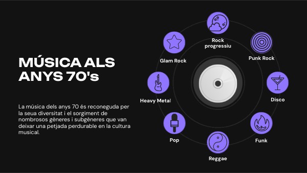 El La música disco dels anys 70 va sorgir com un gènere ballable i vibrant, caracteritzat per ritmes de ball frenètics, grooves enganxosos i arranjaments orquestrals sofisticats. Va ser popularitzat en clubs nocturns i discoteques, amb artistes com Donna Summer, Bee Gees i ABBA dominant les llistes d'èxits. La música disco es va associar amb la moda extravagant i una cultura de festa, reflectint la cerca de diversió i escapisme en una dècada marcada per canvis socials i culturals.