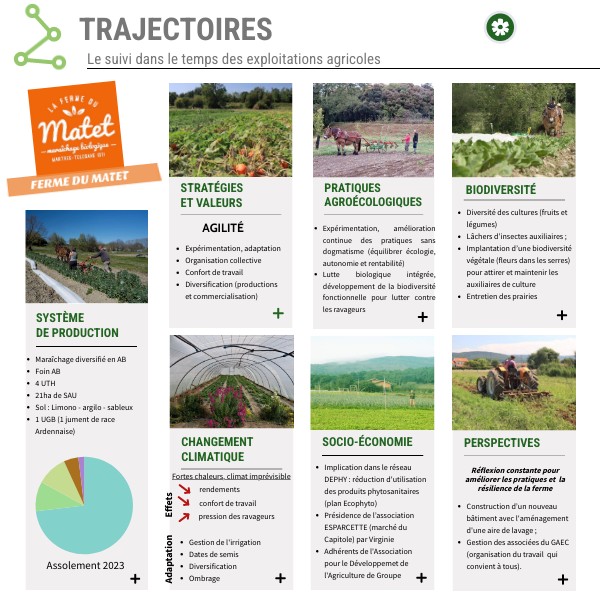 Le GAEC de la ferme du Matet regroupe quatre amis autour d’une activité de maraîchage diversifié en Agriculture Biologique. Fort de la diversité de leur parcours et de leurs savoir-faire respectifs, les associés savent faire évoluer leurs productions et leurs pratiques pour tendre toujours un peu plus vers leurs objectifs tout en s’adaptant aux évolutions du contexte socio-économique et climatique. Travail collectif, rotations, lutte biologique, traction animale, couverts végétaux, diversification des productions et de la commercialisation… L’approche systémique est au cœur de leurs réflexions pour construire un système de production résilient capable de rémunérer convenablement les exploitants.